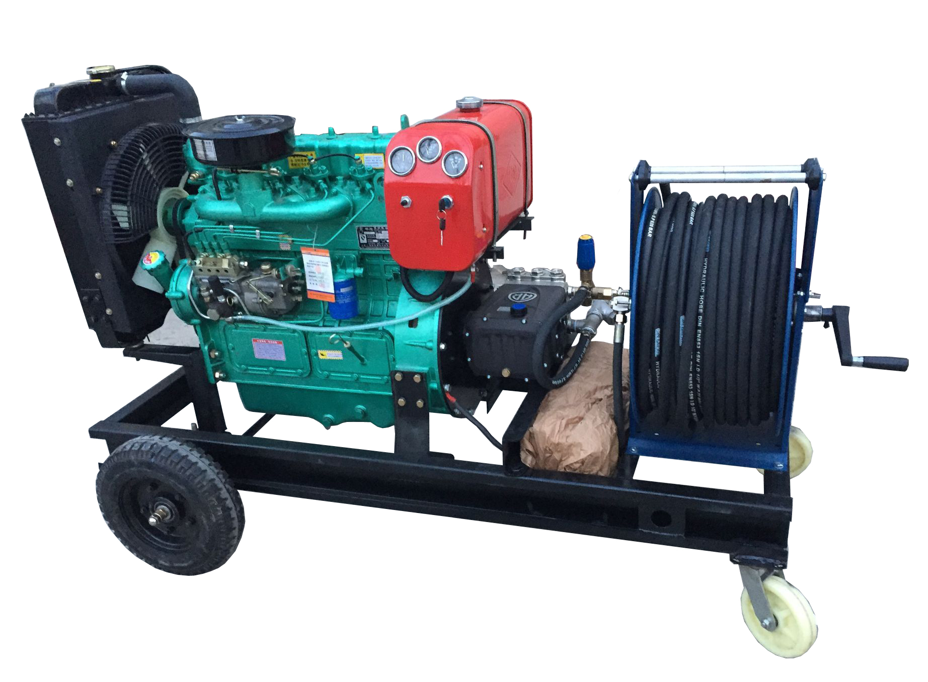 41HP柴油機(jī)驅(qū)動(dòng),意大利工業(yè)陶瓷柱塞高壓泵、意大利PA調(diào)壓閥,不銹鋼壓力表,高壓槍、底盤(pán)和支架。